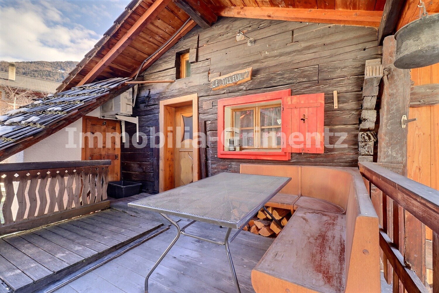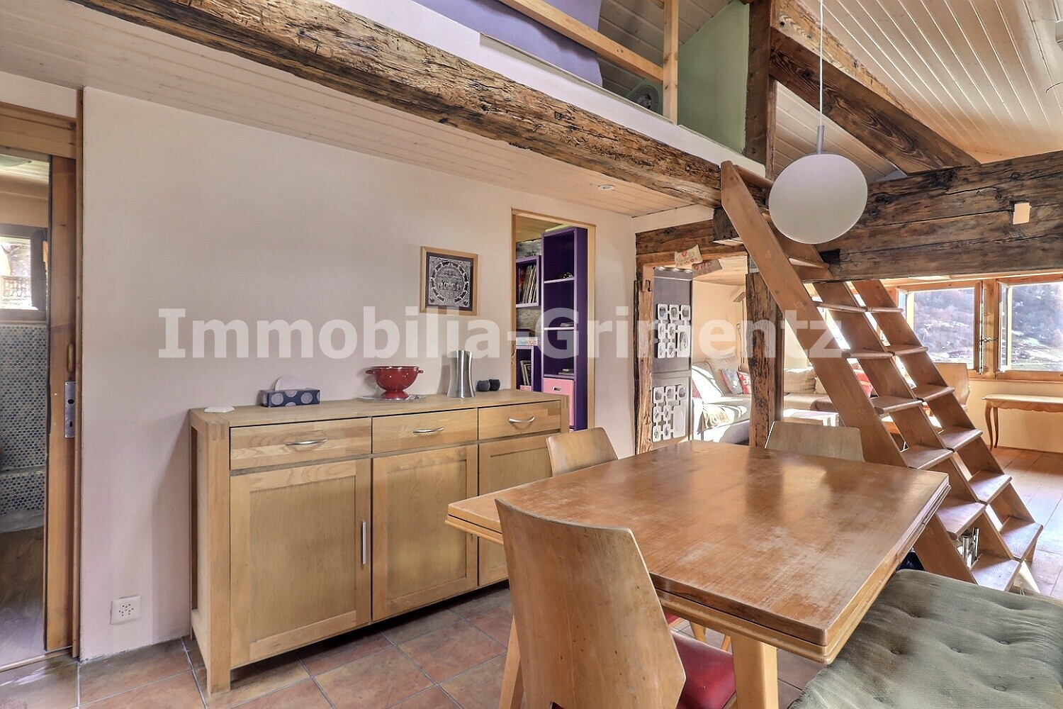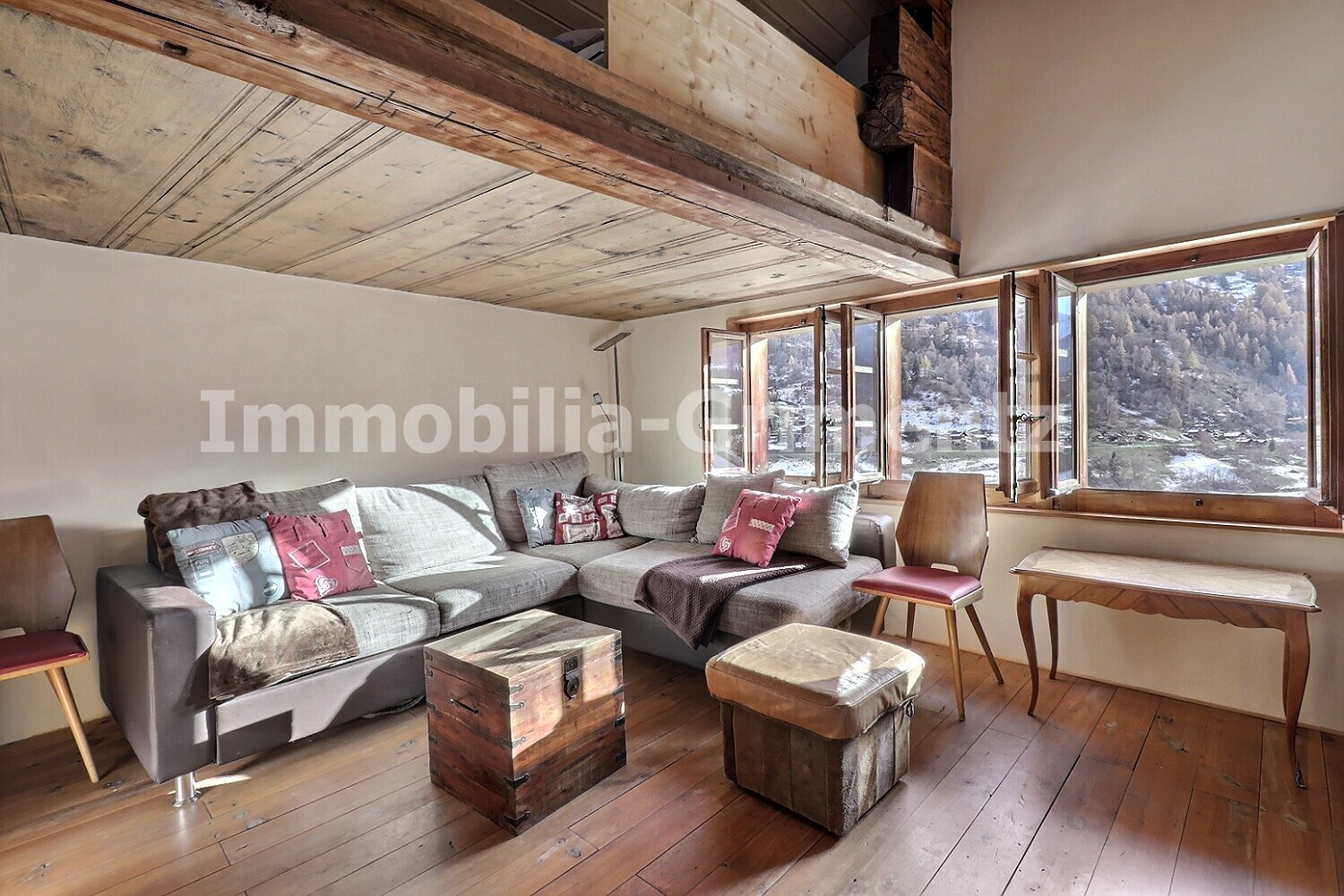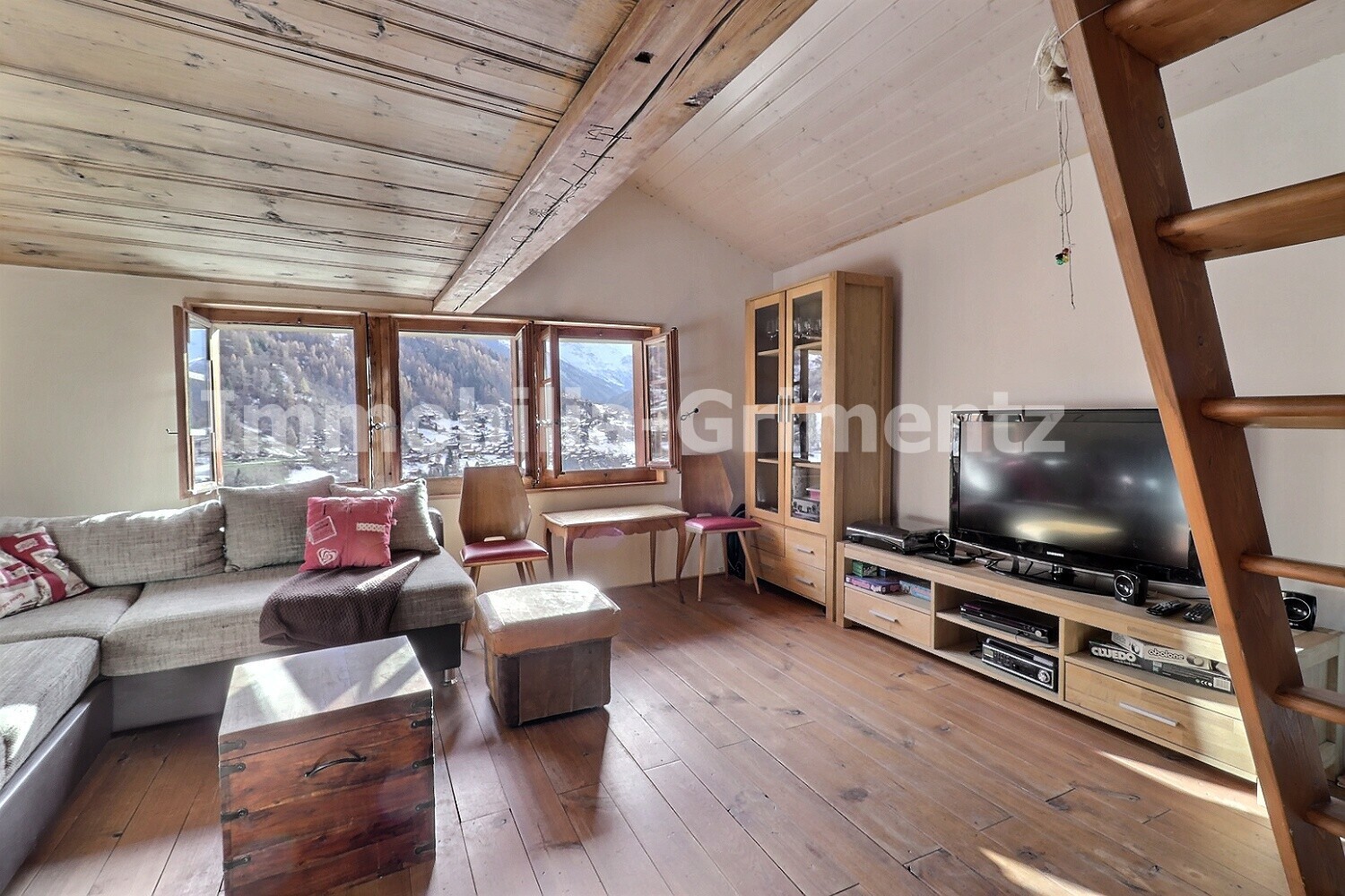 In the heart of the old village of St-Jean d'en-bas, apartment in the attic of a traditional house, entrance kitchen, living room with stove, small mezzanine areas, bedroom, shower room, annex with beds, storage rooms, unobstructed view of the bottom of the Val d'Anniviers.