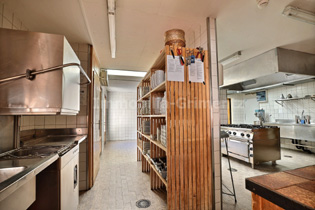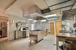 Cuisine professionnelle avec économat, chambre froide, tiroirs réfrigérés, 1 congélateur, cave, cuisinière à gaz 6 plaques, four, sauteuse électrique, steamer, lave-vaisselle, armoire chauffante.